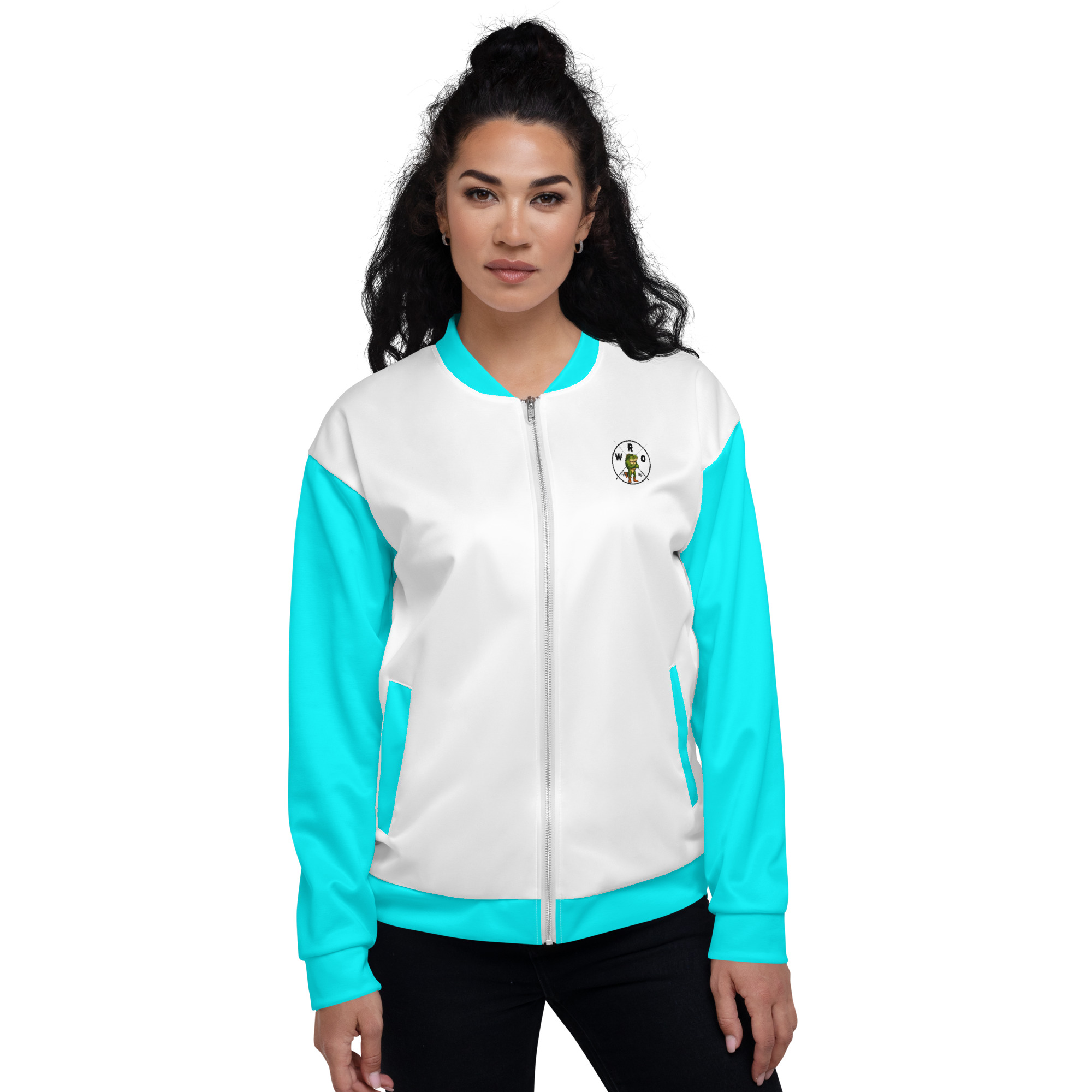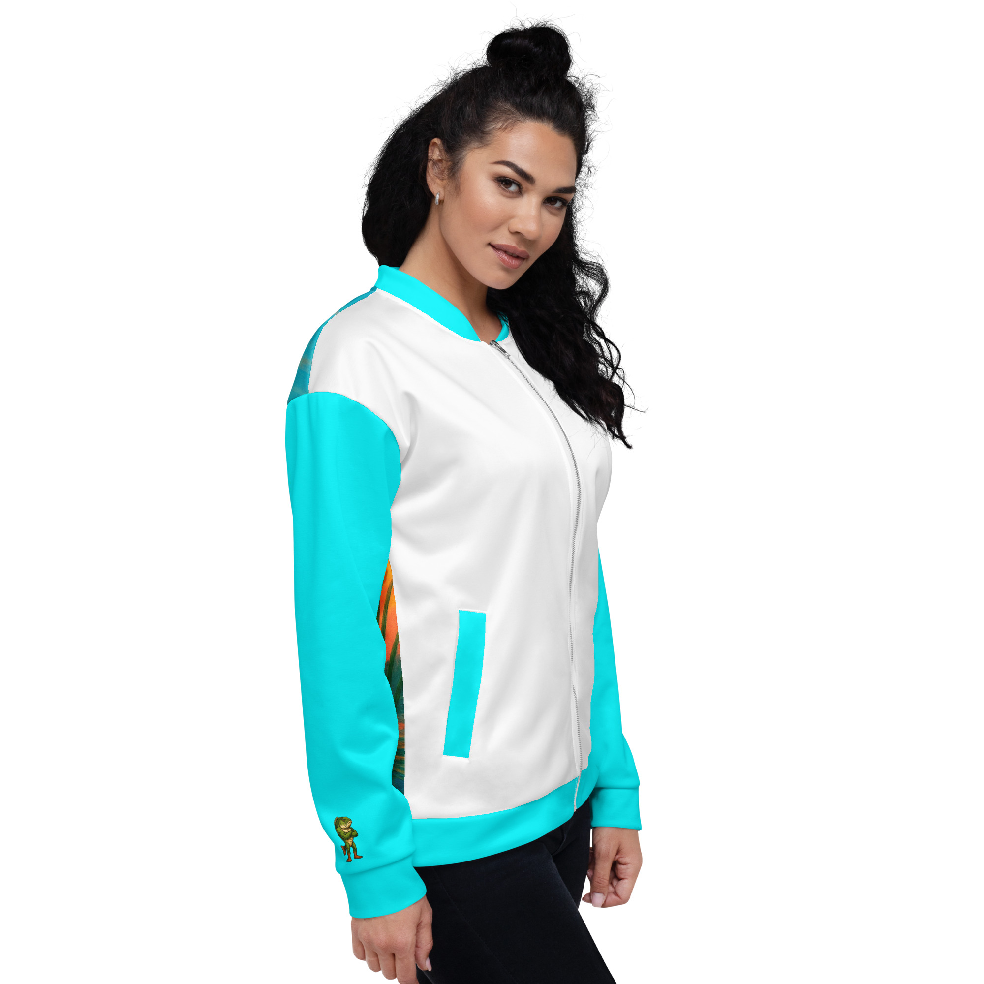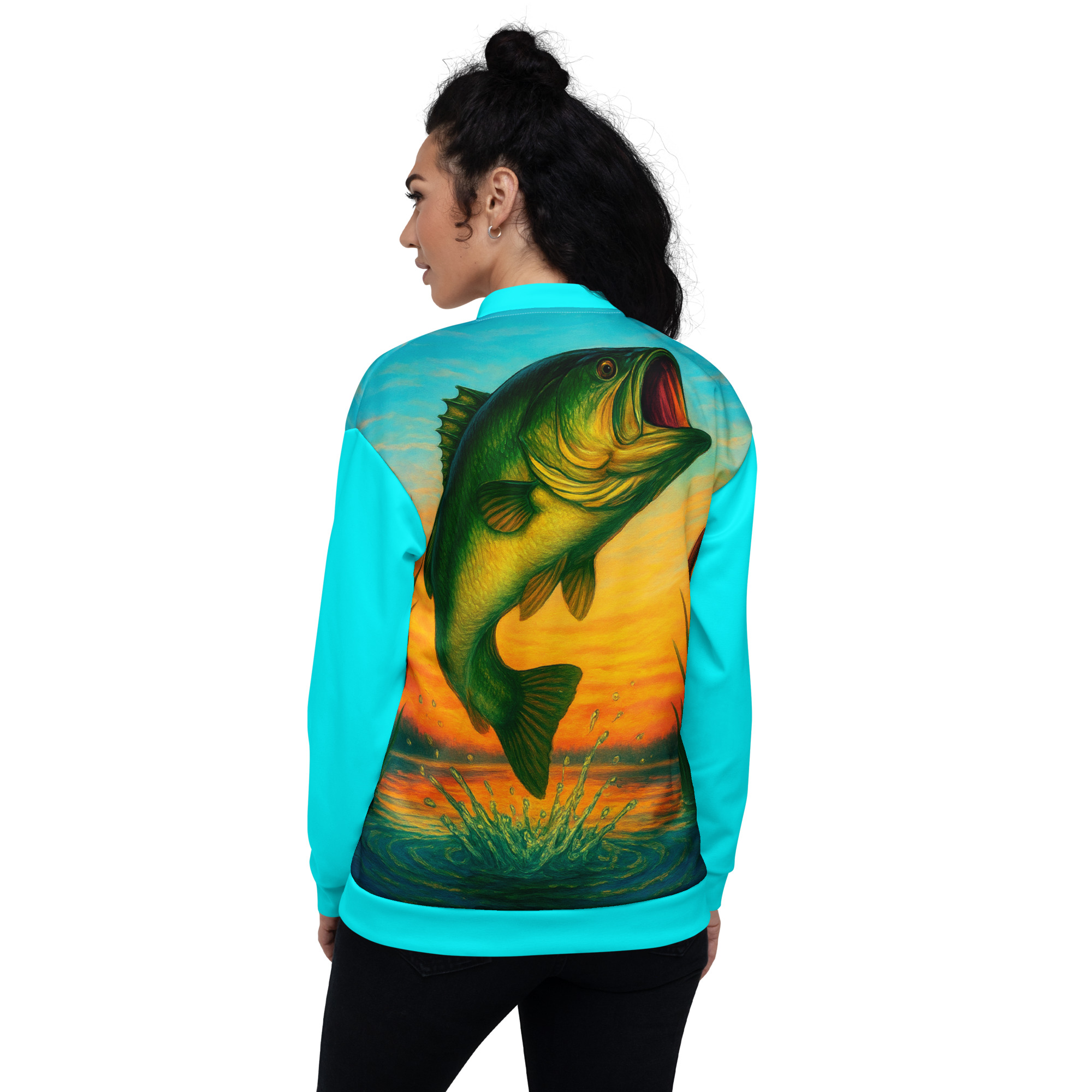 Do you love freshwater fishing? This largemouth bass bomber jacket is for you. It shows a big bass jumping out of the water. The turquoise sleeves add a bold look. Many jackets feel stiff. But, our jacket is soft and light. It has a high-end feel. Specifically, the print is very sharp. Also, the fabric is very smooth. You will love how it feels. So, this is the best pick for a cool day.